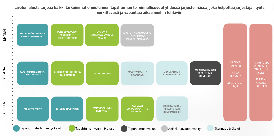 Liveto yhdistää kaikki tapahtumatyökalut samaan paikkaan. Voit myydä lippuja, lisäpalveluita ja tuotteita, hallita osallistujadataa sekä parantaa kävijäkokemusta – ilman välikäsiä. Näin luot sekä unohtumattomia elämyksiä että uusia tulovirtoja samalla kertaa.